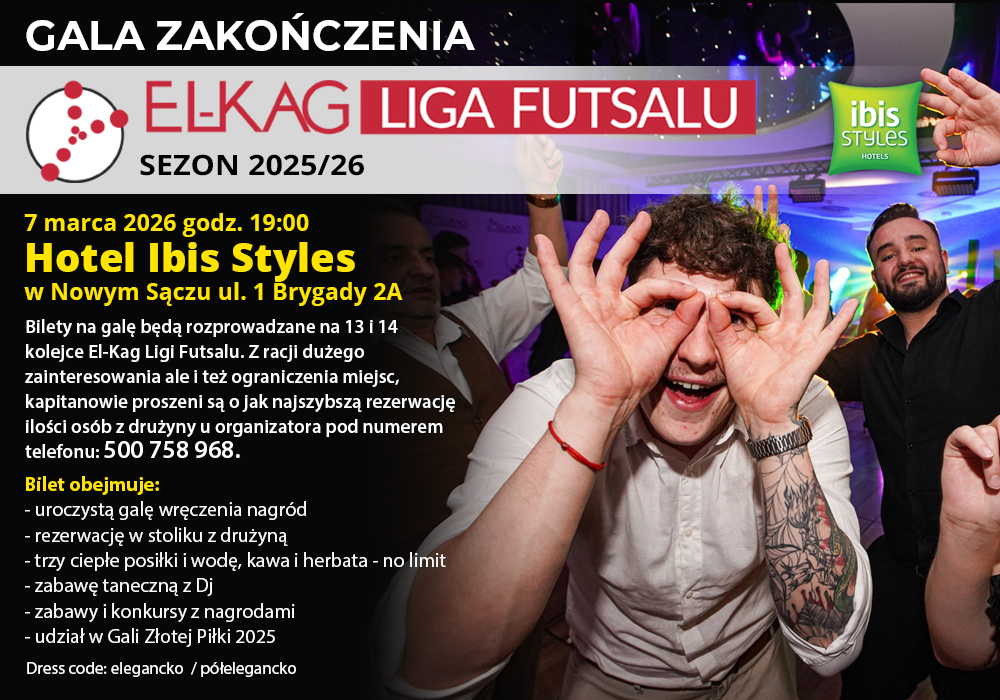 W tym poście chcielibyśmy się z Wami podzielić kilkoma informacjami odnośnie nadchodzącej Gali Zakończenia El-Kag Ligi Futsalu, która odbędzie się 7 marca 2026 roku w Hotelu Ibis Styles w Nowym Sączu, od godziny 19:00. Będzie to finalne zakończenia naszych rozgrywek wraz z wręczeniem nagród indywidu...