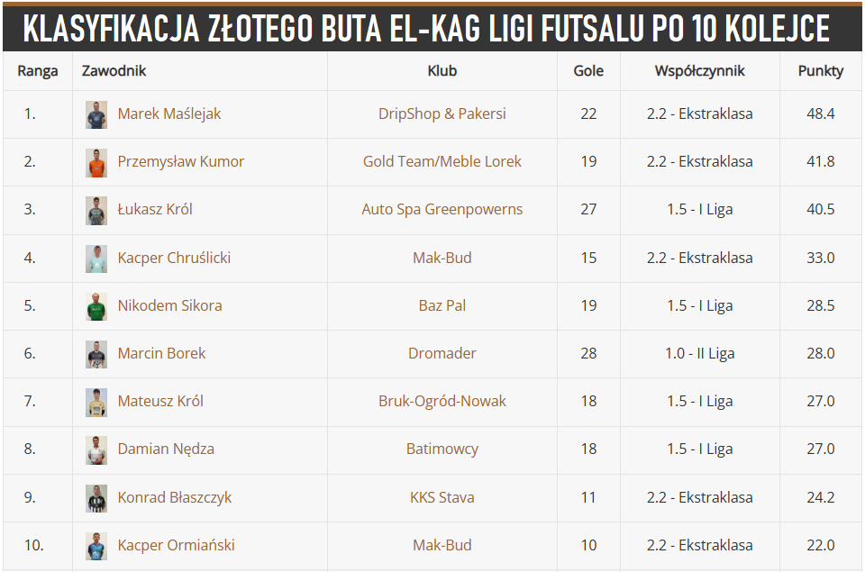 ⚽ Zanim rozpoczniemy 11 kolejkę El-Kag Ligi Futsalu, zobaczmy jak wygląda Klasyfikacja Złotego Buta po 10 seriach gry.
