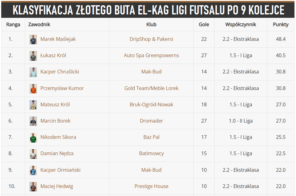 ⚽ Za nami dziewięć rozegranych kolejek El-Kag Ligi Futsalu. Zanim rozpoczniemy dziesiątą serię gier, przyjrzyjmy się dokonaniom strzeleckim piłkarzy, którzy wysoko stoją w Rankingu Złotego Buta, po dziewiątej kolejce.