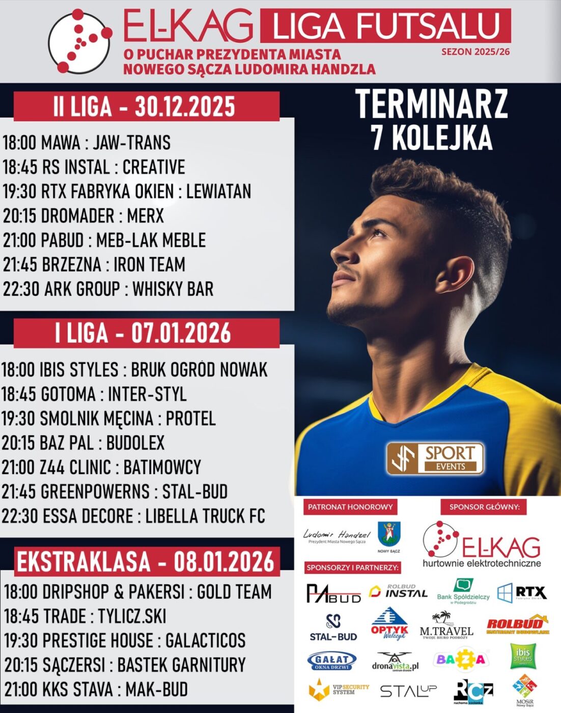 ⚽ Przed nami rozłożona w czasie siódma kolejka El-Kag Ligi Futsalu. Na dzień przed Sylwestrem, rozegramy spotkania II Ligi, by następnie dopiero po Święcie Trzech Króli, powrócić na parkiet i dokończyć siódmą serię gier, meczami w I Lidze oraz Ekstraklasie.