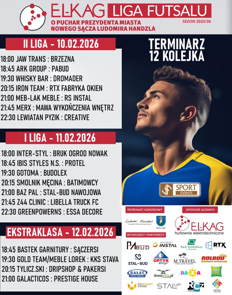 TERMINARZ 12 KOLEJKI EL-KAG LIGI FUTSALU Bez kategorii 10 lutego 2026 Powoli finiszujemy z rozgrywkami El-Kag Ligi Futsalu. Przed nami starcia w 12 serii gier. Zapraszamy na halę MOSiR w Nowym Sączu.
