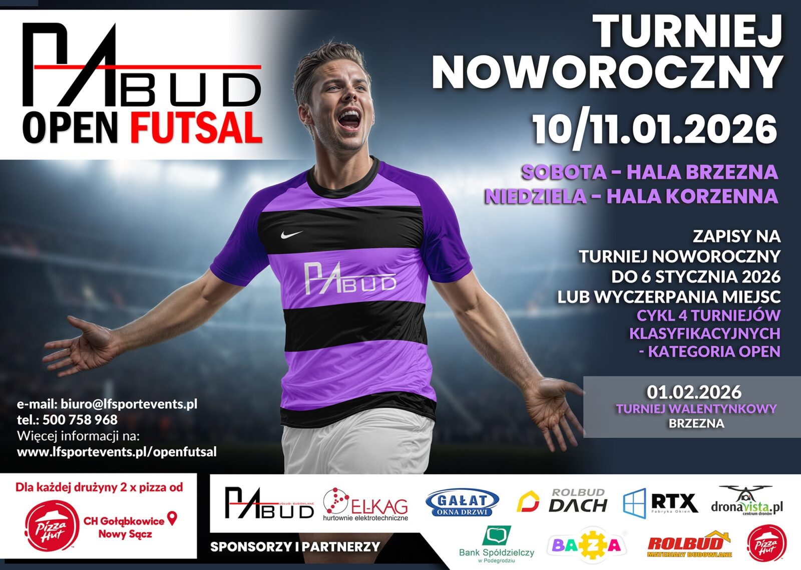 - ZAPISZ drużynę do rozgrywek PABUD OPEN FUTSAL, w kategorii OPEN (bez limitu czynnych zawodników). Z racji dużego zainteresowania TURNIEJ NOWOROCZNY zostanie rozegrany w dwa dni. 10 stycznia będziemy grać na hali sportowej w Brzeznej, natomiast 11 stycznia 2026 roku, na hali sportowej w Korzennej. Godziny rozpoczęcia turnieju oraz system rozgrywek, podamy po zapisach po losowaniu na żywo w specjalnie przygotowanym studiu telewizyjnym. Zgłoszenia drużyn przyjmujemy do 6 stycznia 2026 lub do wyczerpania miejsc (dwa ostatnie wolne miejsca). Losowanie do Turnieju 7 stycznia.