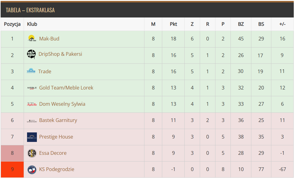 | 5 | Dom Weselny Sylwia | 12 | 13 | 4 | 1 | 7 | 46 | 49 | -3 |