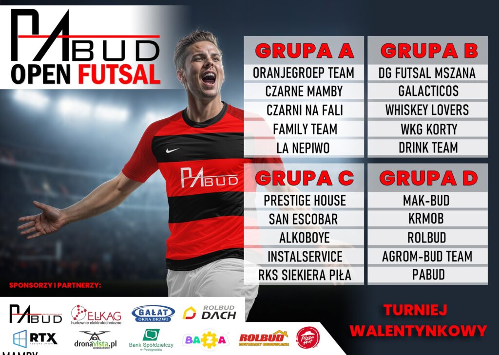 ⚽ Wczoraj dobyło się losowanie do Turnieju Walentynkowego Pabud Open Futsal, po którym poznaliśmy grupy niedzielnego Turnieju. Na grafice przedstawiamy układ grup, a poniżej terminarz meczów. Wszystkie mecze rozegramy na hali widowiskowo-sportowej w Łącku.