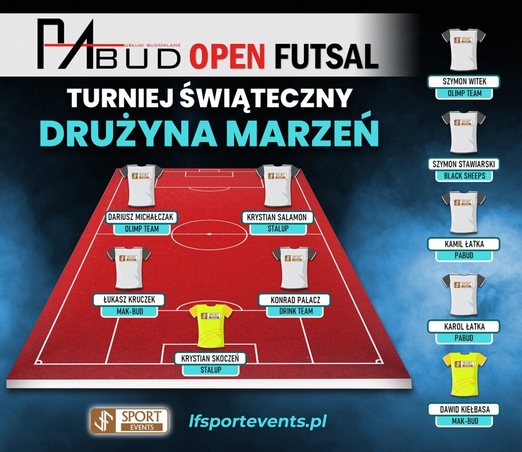 DRUŻYNA MARZEŃ TURNIEJU ŚWIĄTECZNEGO PABUD OPEN FUTSAL 27 grudnia 2024 Wróćmy jeszcze na chwilę do Turnieju Świątecznego. Przedstawiamy najlepszych zawodników, którzy za swoje wybitne występy, zostali nominowani do „Drużyny marzeń” Gratulujemy